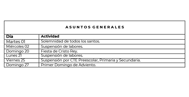 A continuación les damos a conocer las actividades a realizar durante el mes de NOVIEMBRE